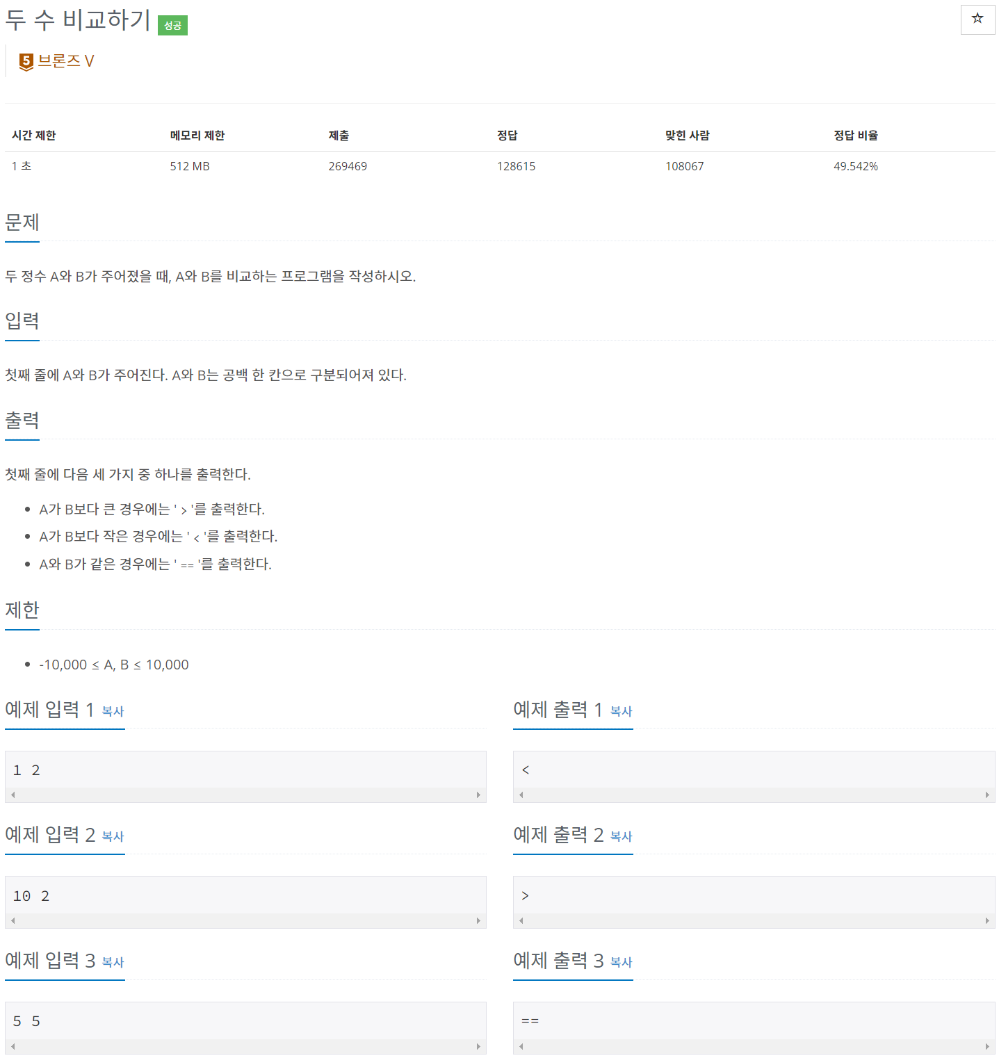 두 정수 A와 B가 주어졌을 때, A와 B를 비교하는 프로그램을 작성하시오.