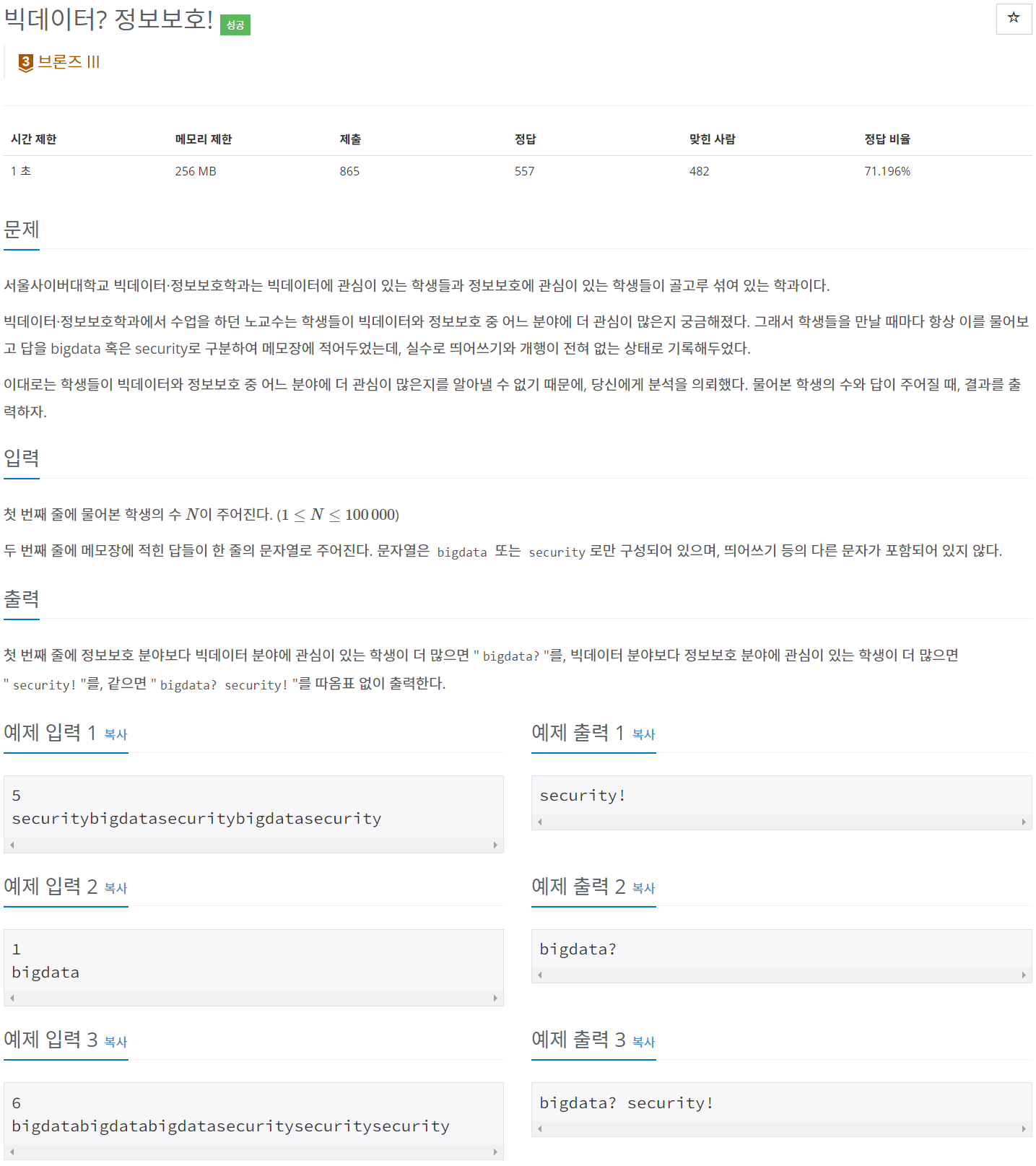 첫 번째 줄에 정보보호 분야보다 빅데이터 분야에 관심이 있는 학생이 더 많으면 "bigdata?"를, 빅데이터 분야보다 정보보호 분야에 관심이 있는 학생이 더 많으면 "security!"를, 같으면 "bigdata? securit