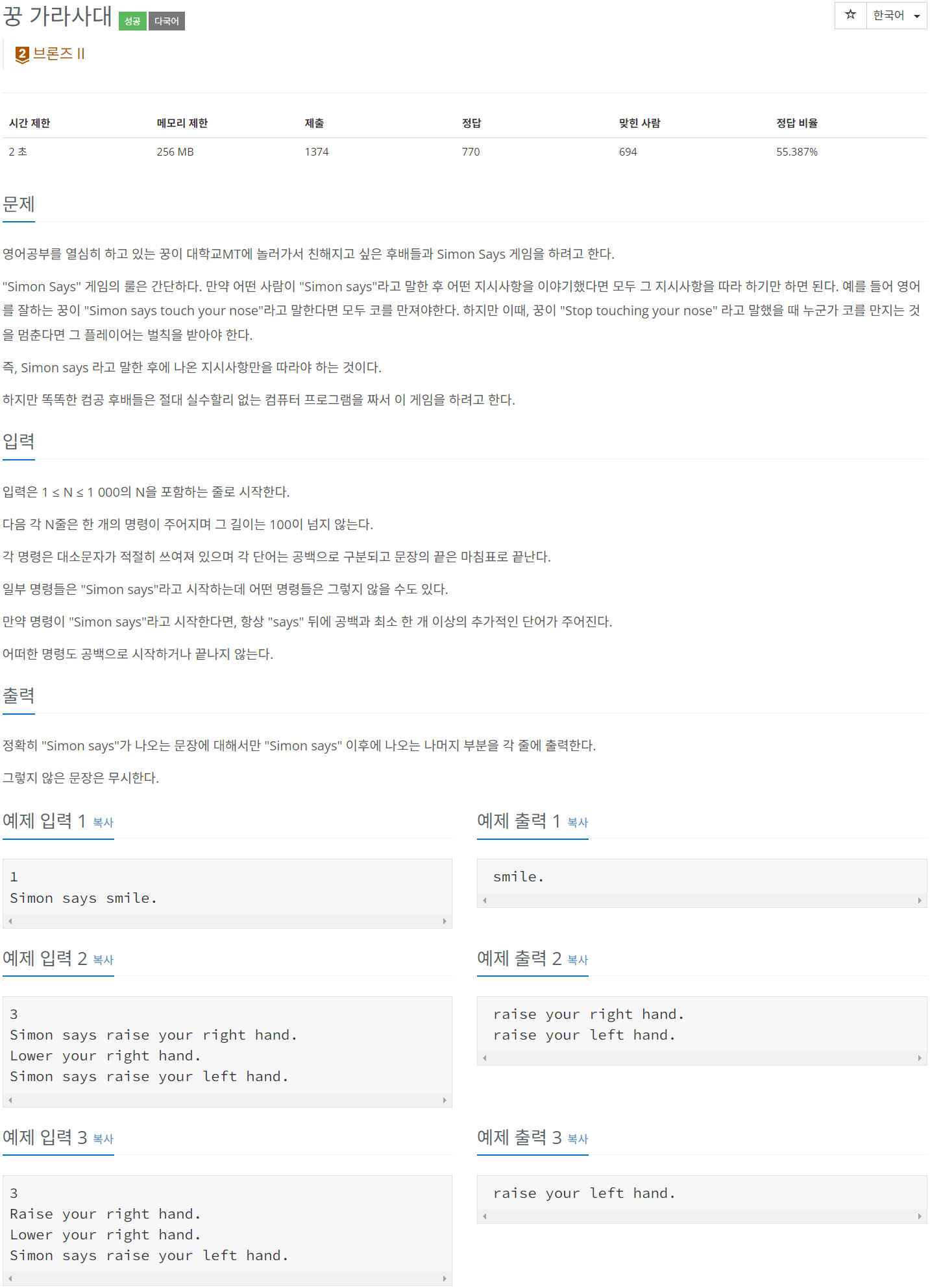 영어공부를 열심히 하고 있는 꿍이 대학교MT에 놀러가서 친해지고 싶은 후배들과 Simon Says 게임을 하려고 한다. "Simon Says" 게임의 룰은 간단하다. 만약 어떤 사람이 "Simon says"라고 말한 후 어떤 지