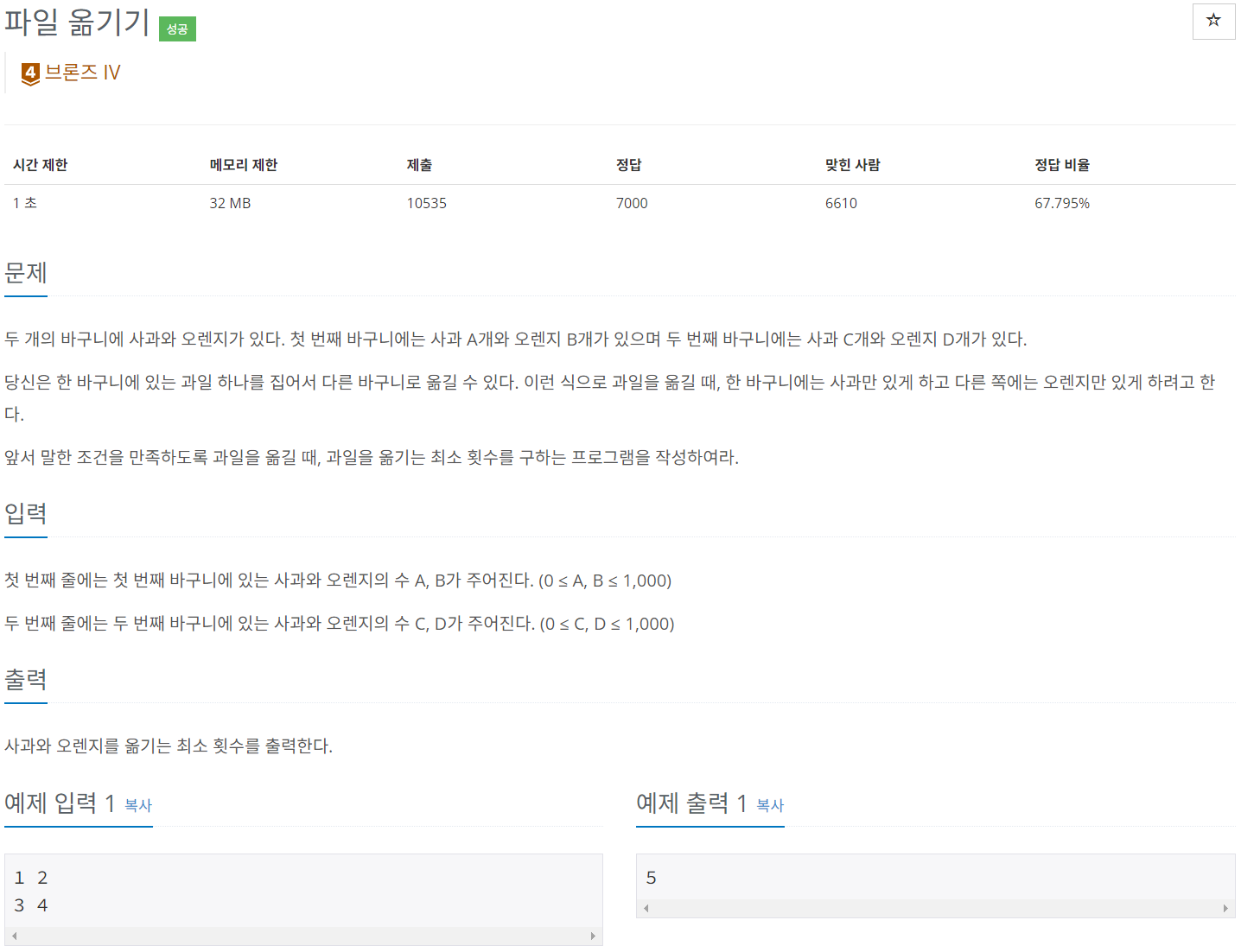 첫 번째 줄에는 첫 번째 바구니에 있는 사과와 오렌지의 수 A, B가 주어진다. (0 ≤ A, B ≤ 1,000) 두 번째 줄에는 두 번째 바구니에 있는 사과와 오렌지의 수 C, D가 주어진다. (0 ≤ C, D ≤ 1,000)