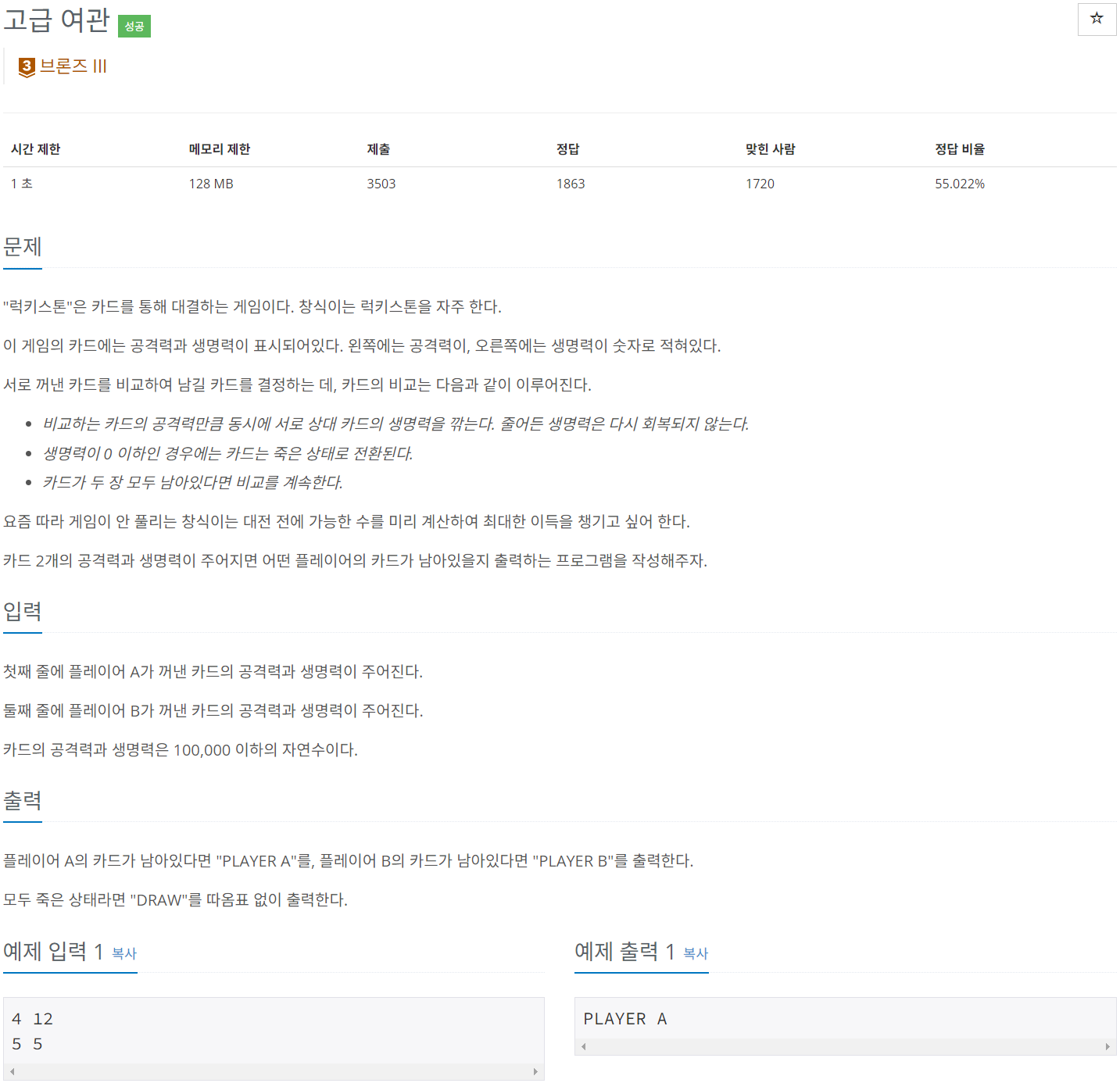 A 카드(B 카드)가 B 카드(A 카드)를 몇 번 공격해야 HP를 0 이하로 만들 수 있는지 확인하면 된다.