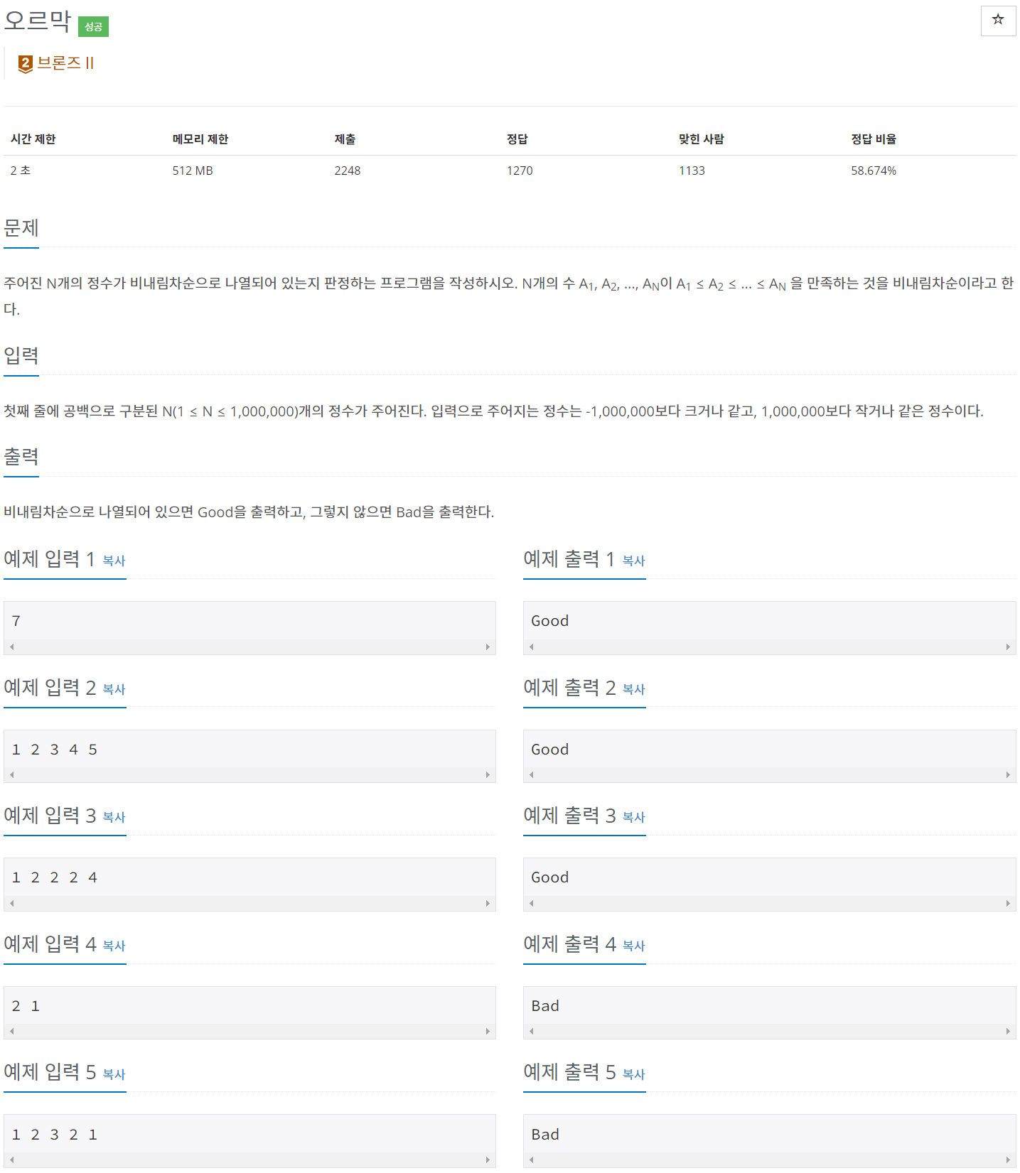 백준 BAEKJOON 14910번 오르막 [PYTHON/파이썬]