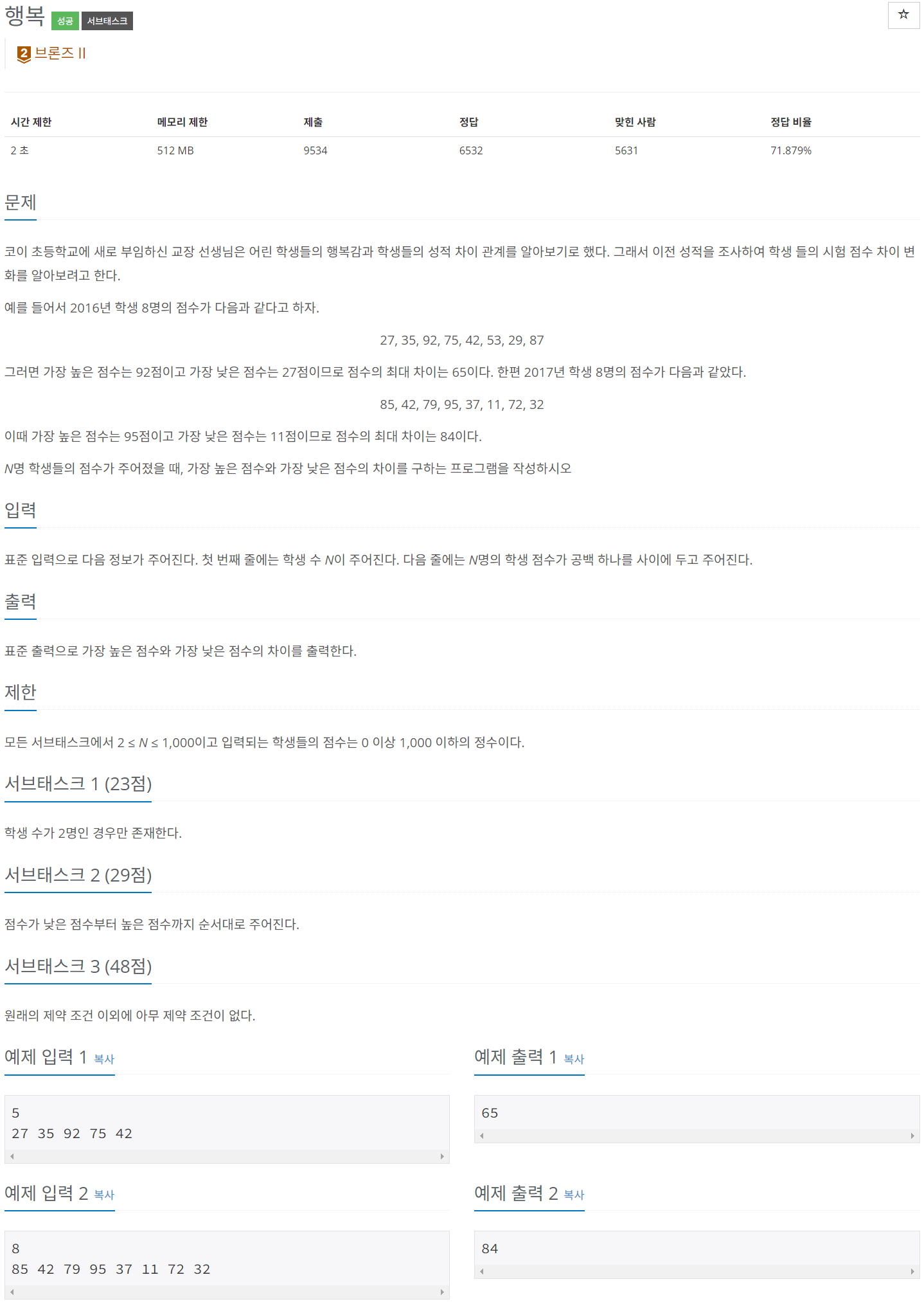 모든 서브태스크에서 2 ≤ N ≤ 1,000이고 입력되는 학생들의 점수는 0 이상 1,000 이하의 정수이다.
