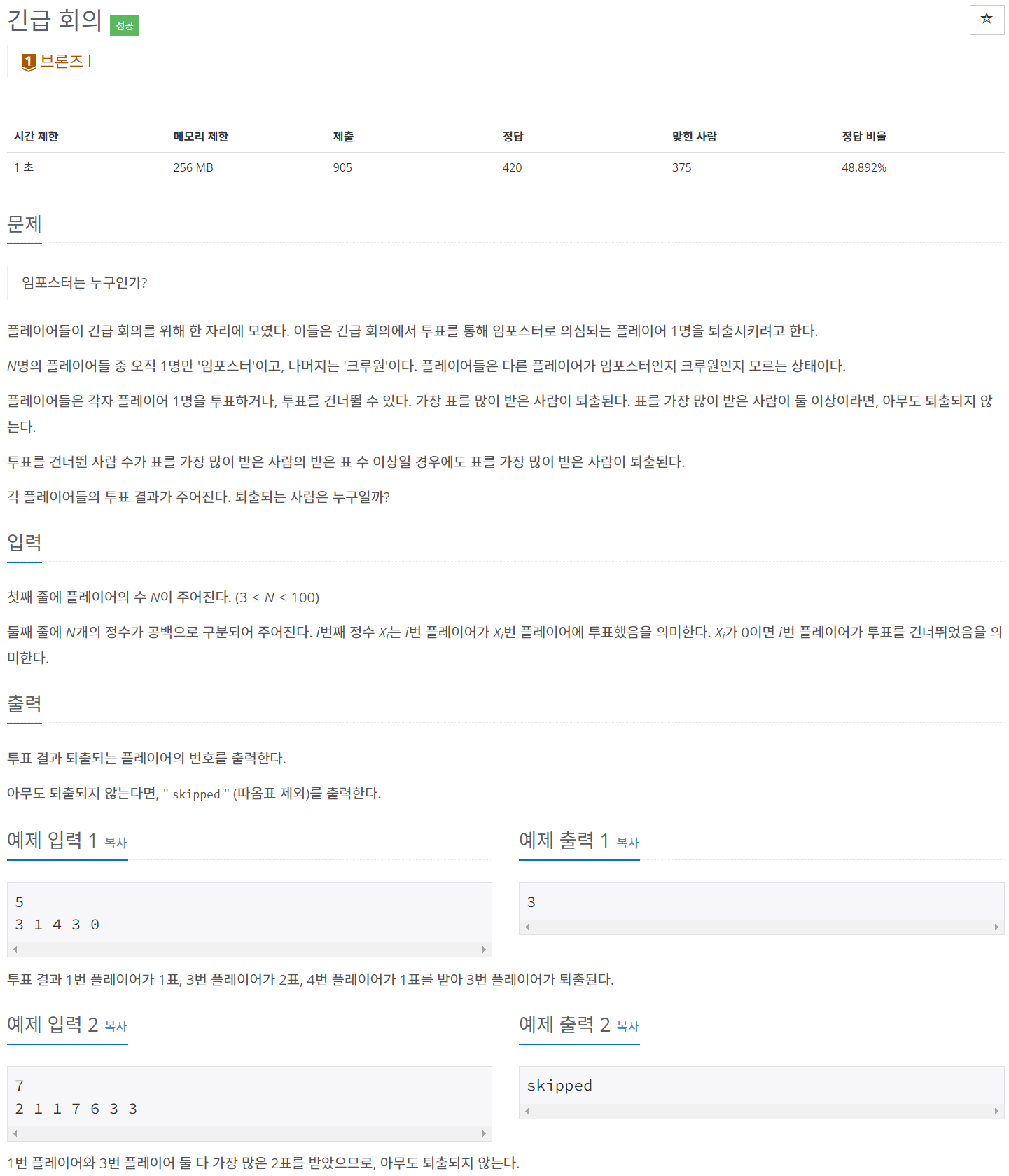 (가장 많은 투표를 받은 사람이 여러명이거나 아무도 받지 못했다면 'skipped' 출력)