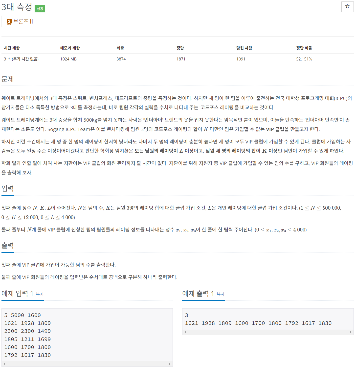 첫째 줄에 정수 $N$, $K$, $L$이 주어진다. $N$은 팀의 수, $K$는 팀원 $3$명의 레이팅 합에 대한 클럽 가입 조건, $L$은 개인 레이팅에 대한 클럽 가입 조건이다. ($1 \leq N \leq 500\ 000$, $0 \leq K \leq 12\ 000$, $