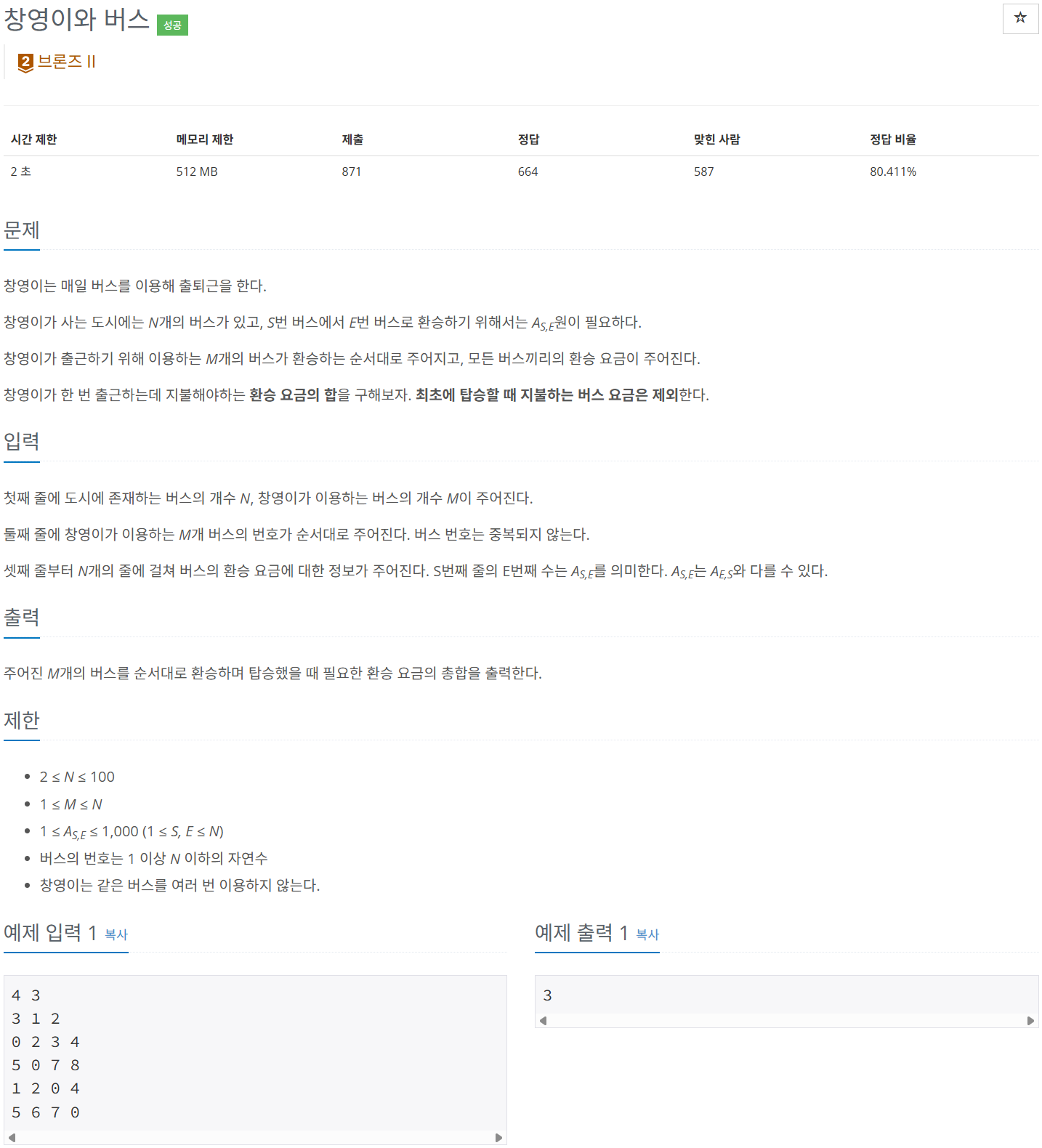 result += bus_cost[S - 1][E - 1] # 0번째 인덱스를 고려한 -1