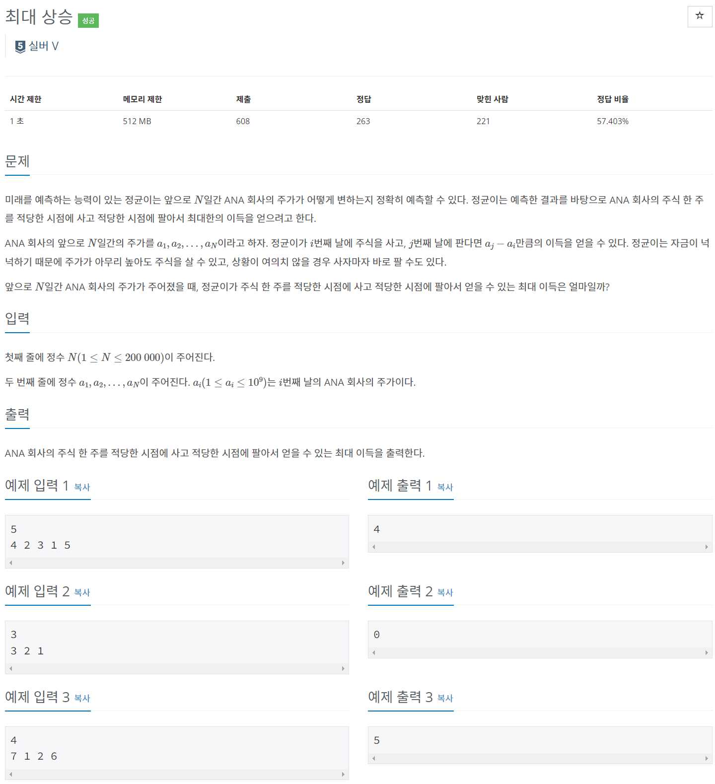 가장 비싸게 팔 수 있는 날을 갱신하고 가장 싸게 살 수 있는 날을 찾아서 빼주면 최댓값을 구할 수 있다.