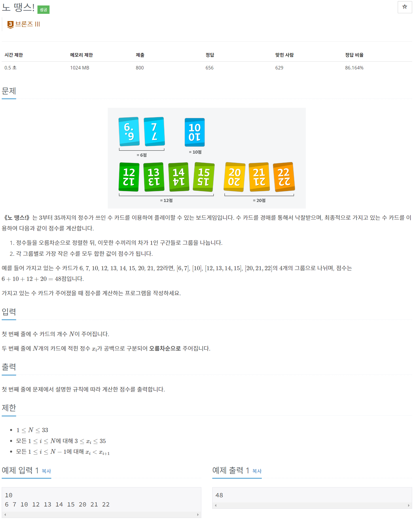 《노 땡스!》는 $3$부터 $35$까지의 정수가 쓰인 수 카드를 이용하여 플레이할 수 있는 보드게임입니다. 수 카드를 경매를 통해서 낙찰받으며, 최종적으로 가지고 있는 수 카드를 이용하여 다음과