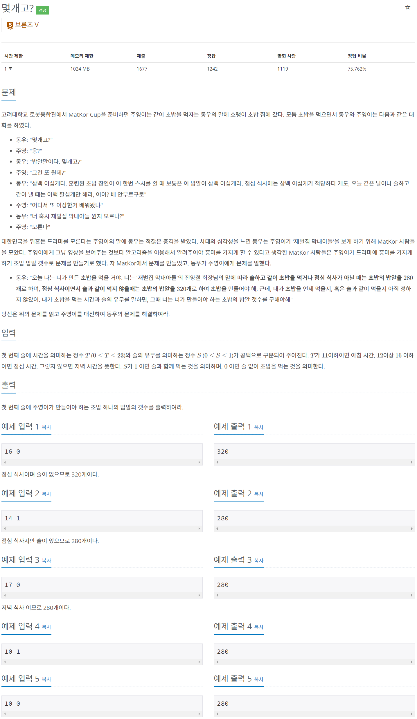 첫 번째 줄에 시간을 의미하는 정수 $T$ ($0 \le T \le 23$)와 술의 유무를 의미하는 정수 $S$ ($0 \le S \le 1$)가 공백으로 구분되어 주어진다. $T$가 $11$이하이면 아침 시간, $12$이상 $16$ 이하이면 점심 시