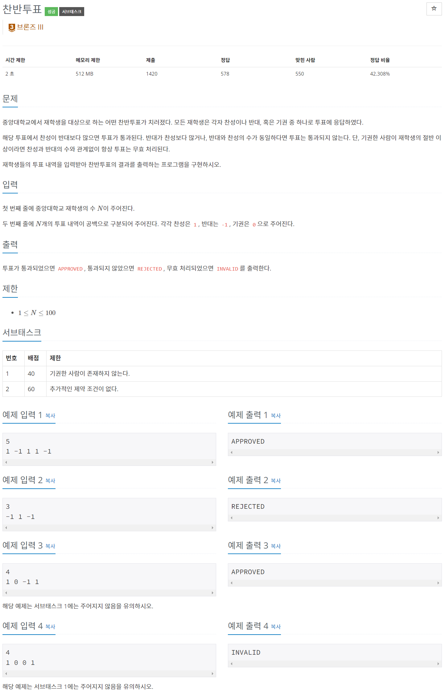 투표가 통과되었으면 APPROVED, 통과되지 않았으면 REJECTED, 무효 처리되었으면 INVALID를 출력한다.