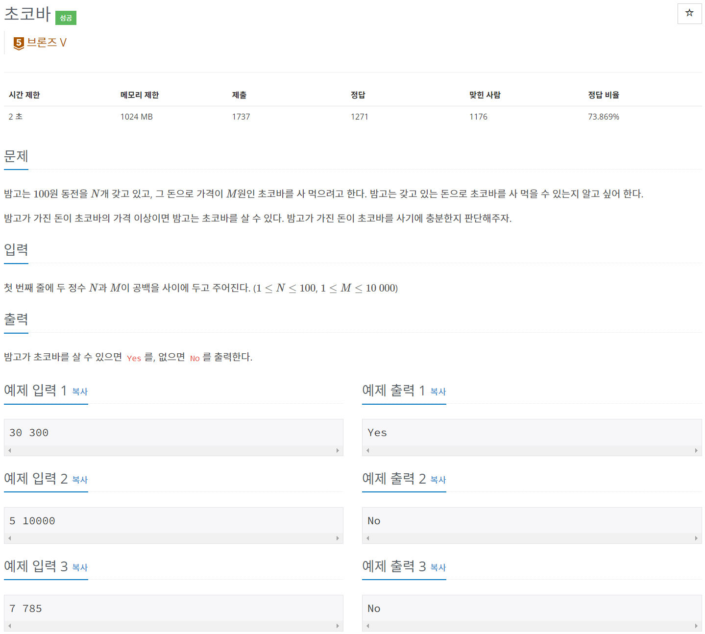 밤고는 $100$원 동전을 $N$개 갖고 있고, 그 돈으로 가격이 $M$원인 초코바를 사 먹으려고 한다. 밤고는 갖고 있는 돈으로 초코바를 사 먹을 수 있는지 알고 싶어 한다. 밤고가 가진 돈이 초코바의