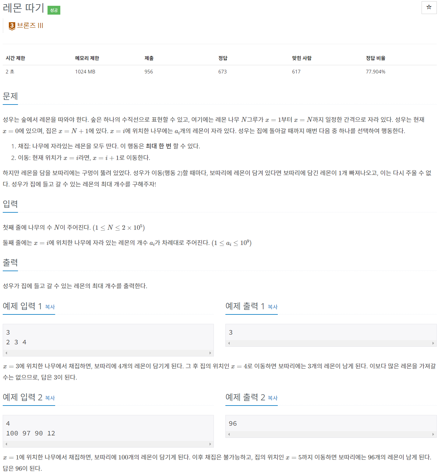lemon = [trees[i] - (N - i) for i in range(N)] # 이동하면서 흘린 레몬 개수 차감