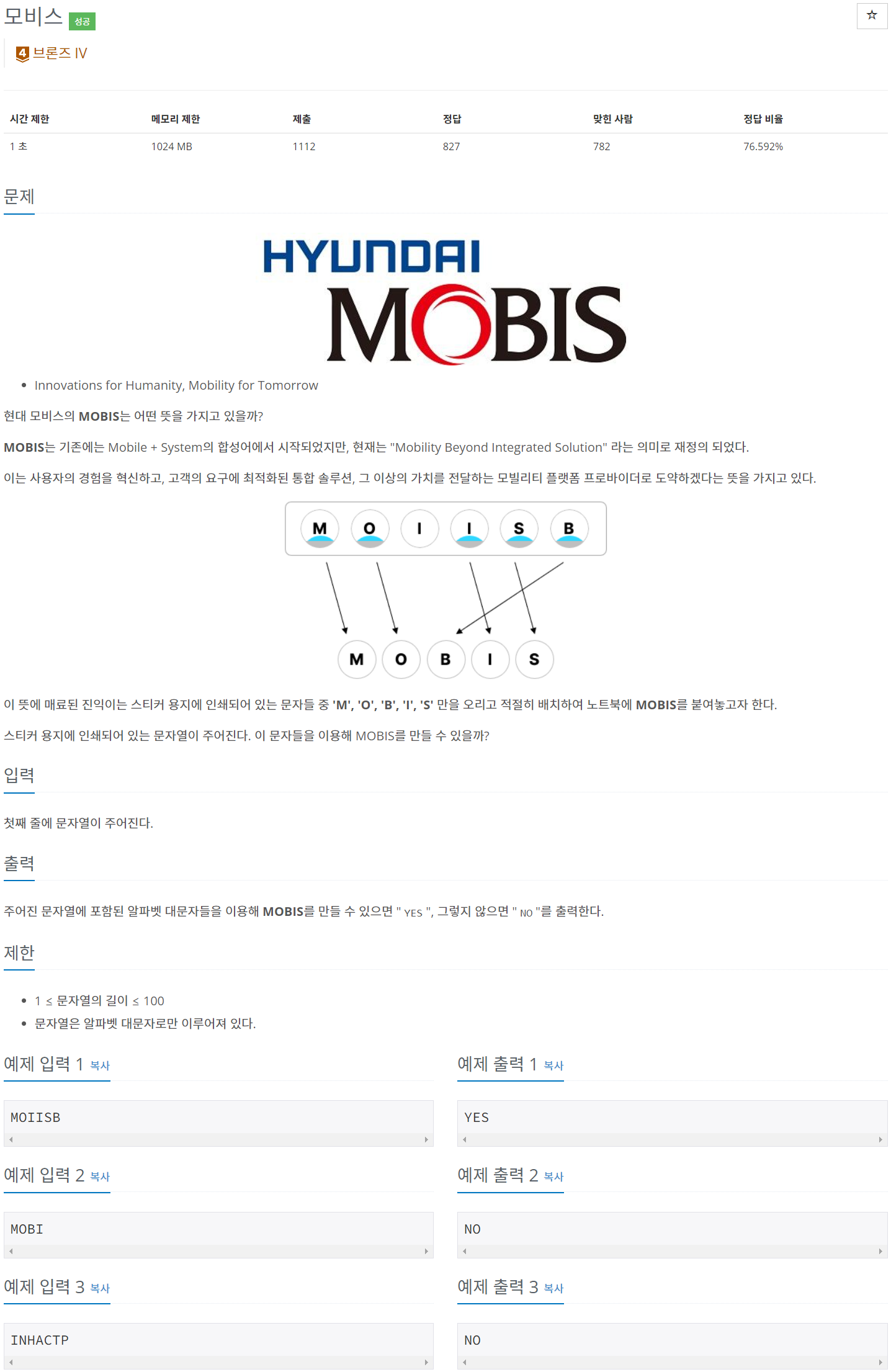 주어진 문자열에 포함된 알파벳 대문자들을 이용해 MOBIS를 만들 수 있으면 "YES", 그렇지 않으면 "NO"를 출력한다.