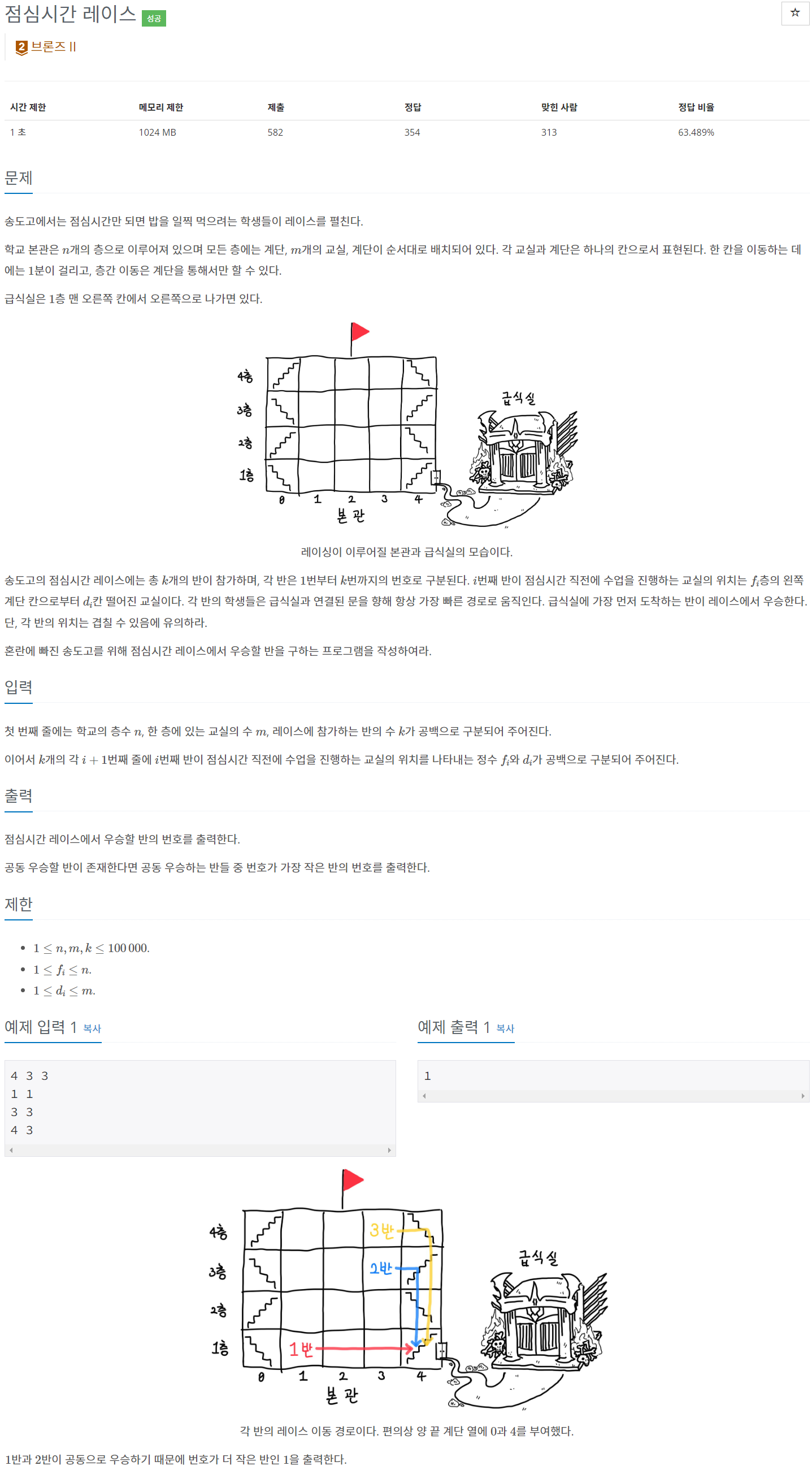 첫 번째 줄에는 학교의 층수 $n$, 한 층에 있는 교실의 수 $m$, 레이스에 참가하는 반의 수 $k$가 공백으로 구분되어 주어진다. 이어서 $k$개의 각 $i+1$번째 줄에 $i$번째 반이 점심시간 직전에 수업