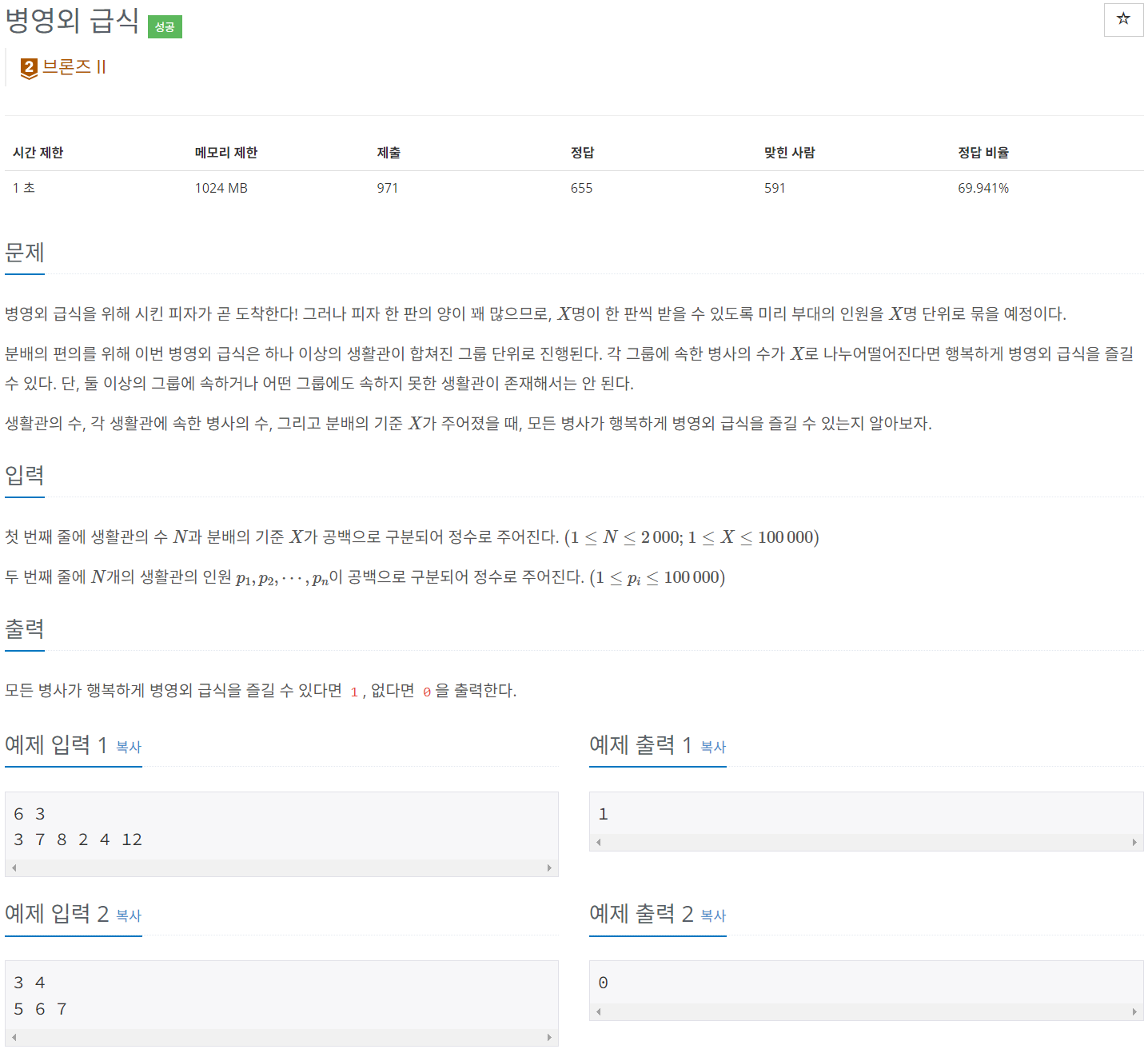 첫 번째 줄에 생활관의 수 $N$과 분배의 기준 $X$가 공백으로 구분되어 정수로 주어진다. $(1 \le N \le 2\,000;$ $1 \le X \le 100\,000)$ 두 번째 줄에 $N$개의 생활관의 인원 $p_1,p_2,\cdots,p_n$이 공백으로 구분