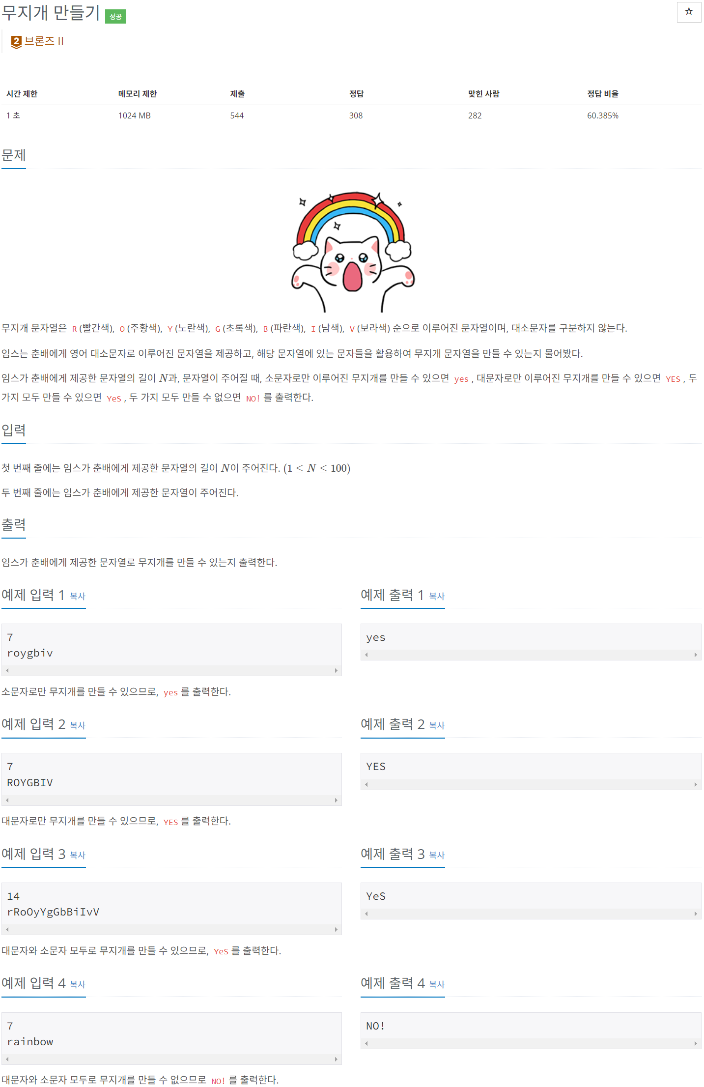 무지개 문자열은 R(빨간색), O(주황색), Y(노란색), G(초록색), B(파란색), I(남색), V(보라색) 순으로 이루어진 문자열이며, 대소문자를 구분하지 않는다. 임스는 춘배에게 영어 대소문자로 이루어진