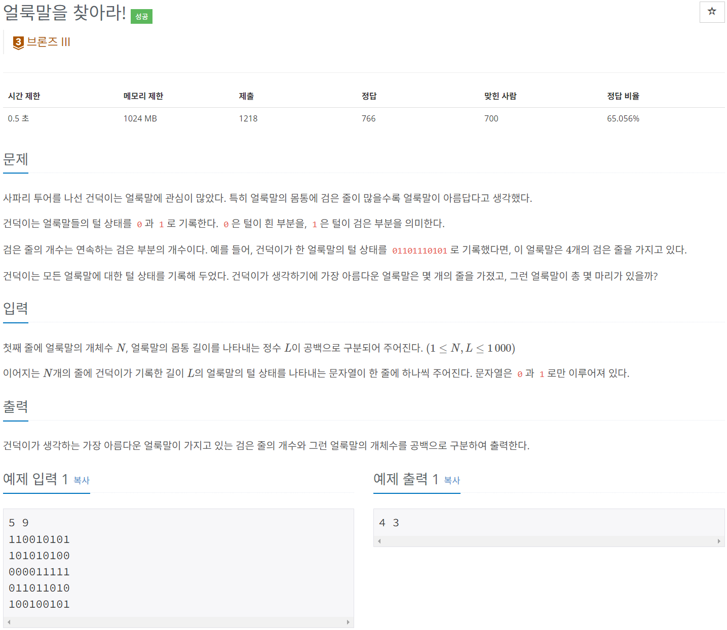 max와 count를 적절하게 사용하여 검은 줄의 개수와 그런 얼룩말의 개채수를 출력하였다.