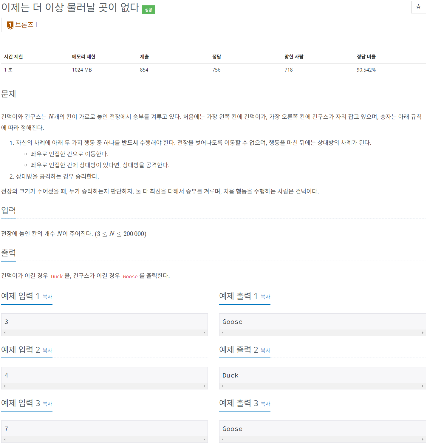 건덕이와 건구스는 $N$개의 칸이 가로로 놓인 전장에서 승부를 겨루고 있다. 처음에는 가장 왼쪽 칸에 건덕이가, 가장 오른쪽 칸에 건구스가 자리 잡고 있으며, 승자는 아래 규칙에 따라 정해진