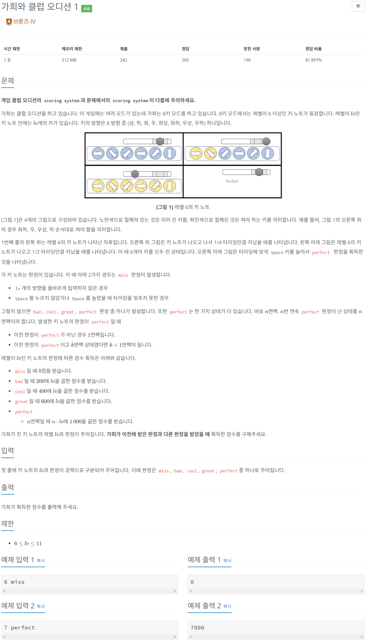 첫 줄에 키 노트의 $lv$과 판정이 공백으로 구분되어 주어집니다. 이때 판정은 miss, bad, cool, great, perfect중 하나로 주어집니다.