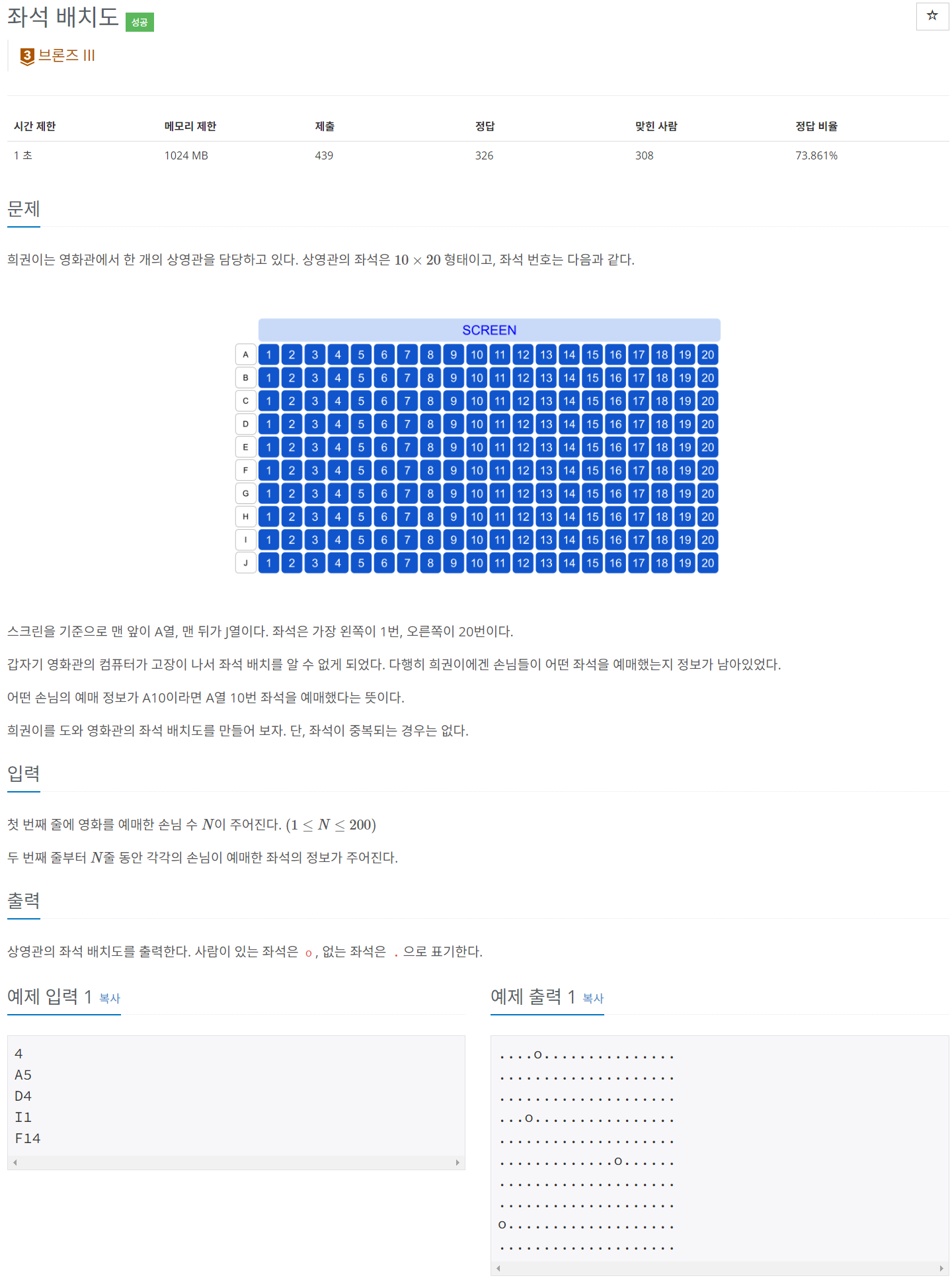 희권이는 영화관에서 한 개의 상영관을 담당하고 있다. 상영관의 좌석은 $10\times 20$ 형태이고, 좌석 번호는 다음과 같다. 스크린을 기준으로 맨 앞이 A열, 맨 뒤가 J열이다. 좌석은 가장 왼쪽이 1