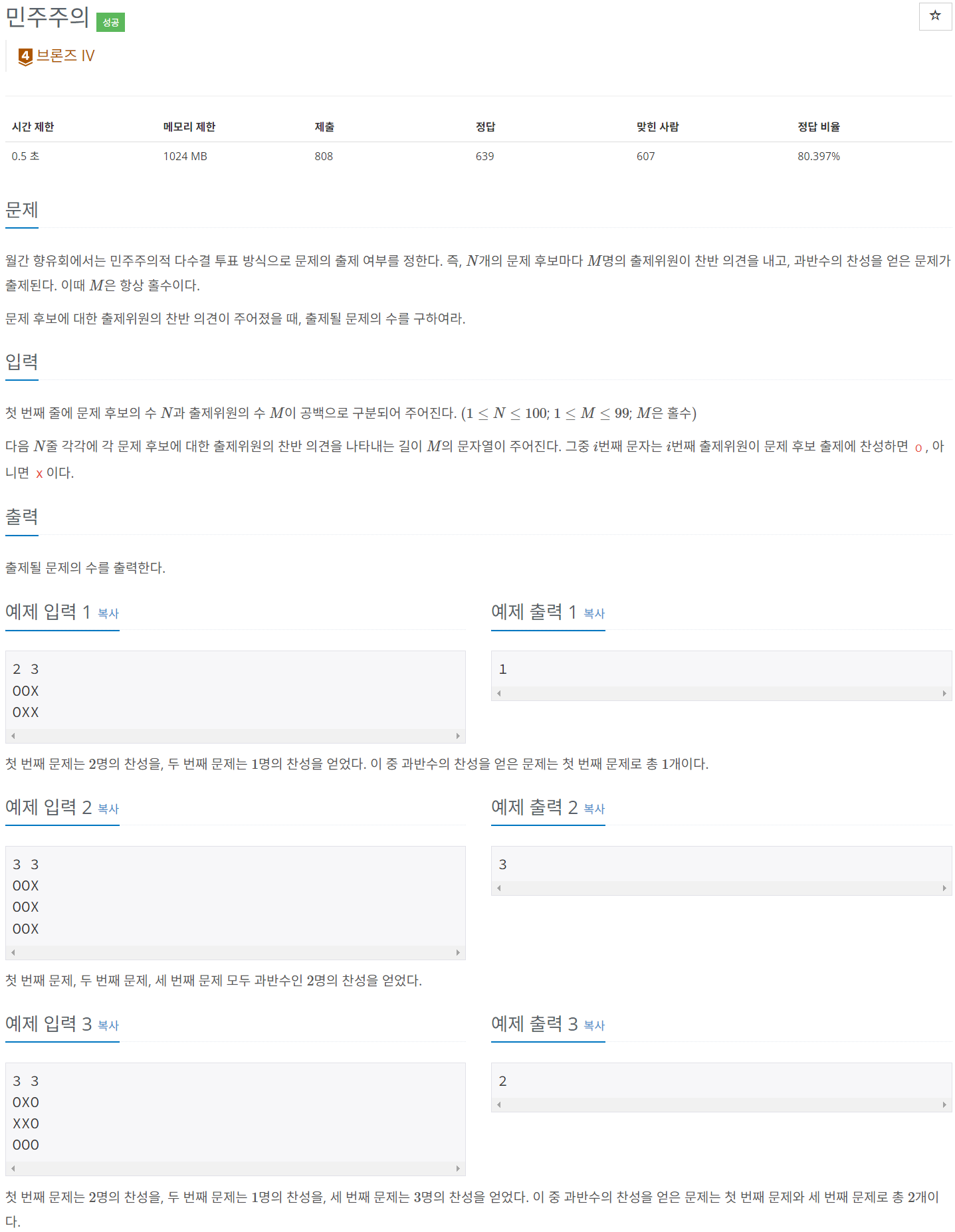 월간 향유회에서는 민주주의적 다수결 투표 방식으로 문제의 출제 여부를 정한다. 즉, $N$개의 문제 후보마다 $M$명의 출제위원이 찬반 의견을 내고, 과반수의 찬성을 얻은 문제가 출제된다. 이때