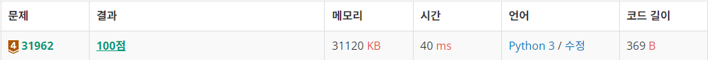 | 백준 BAEKJOON 31994번 강당 대관 [PYTHON/파이썬] (0) | 2024.07.19 |
