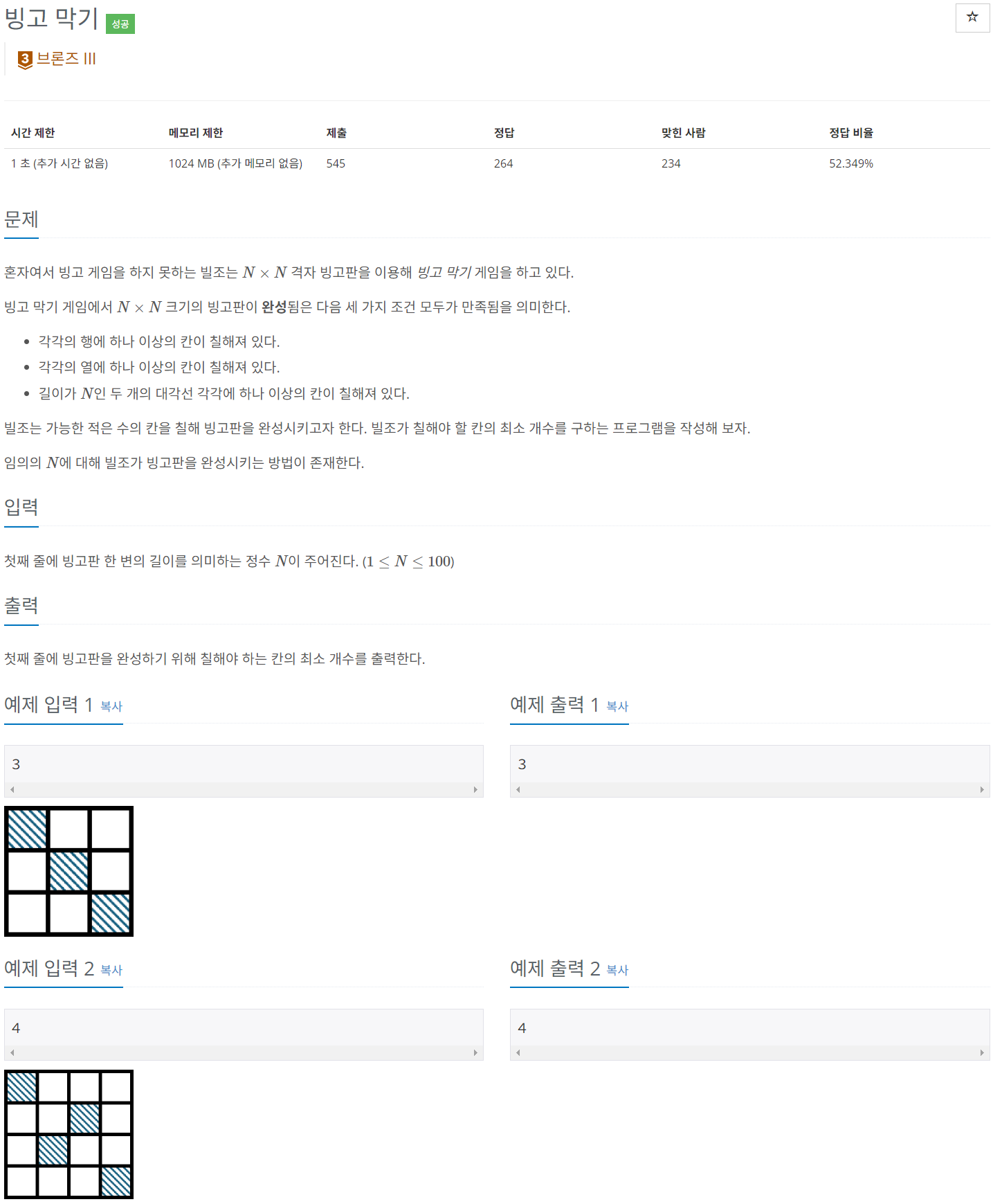 처음에는 예제 풀이만 보고 빙고판에 칠해야 하는 칸이 N개인 줄 알았으나 N이 2일 때만 함정이 숨어있었다.