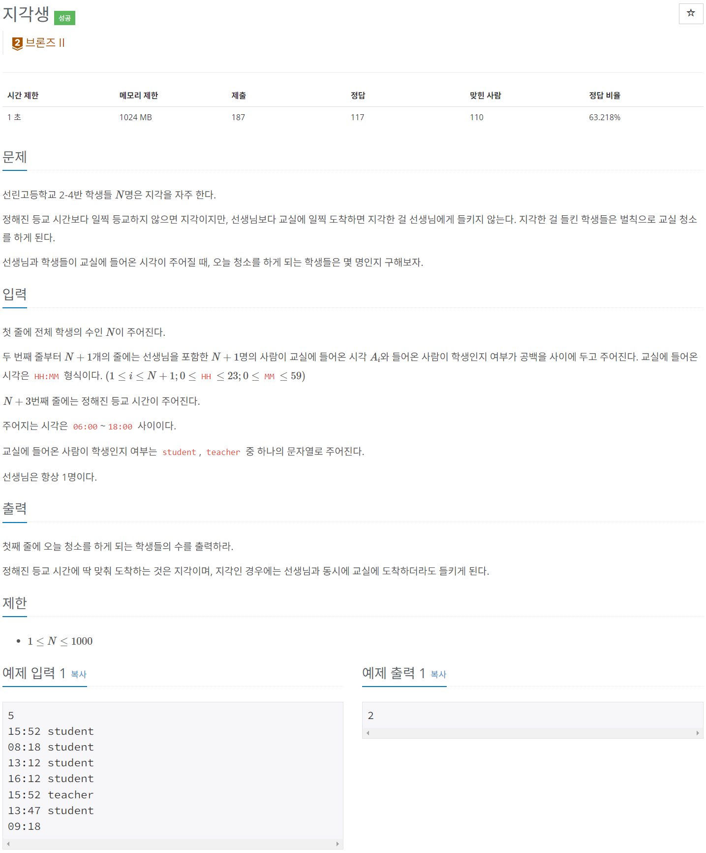 정해진 등교 시간과 선생님이 도착한 시간보다 크거나 같을 때가 지각이기에