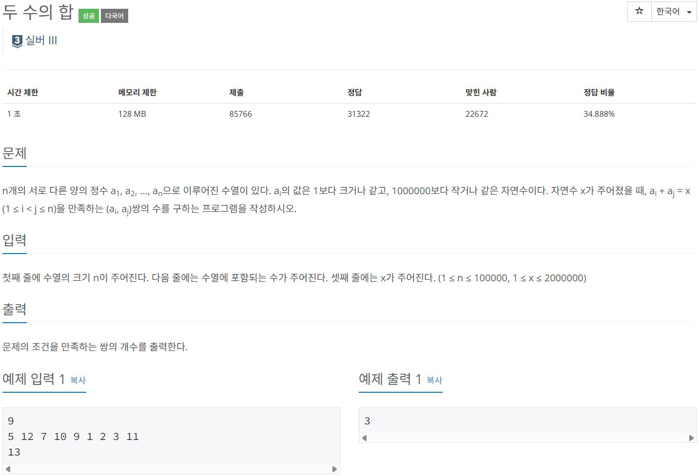 https://www.acmicpc.net/problem/3273