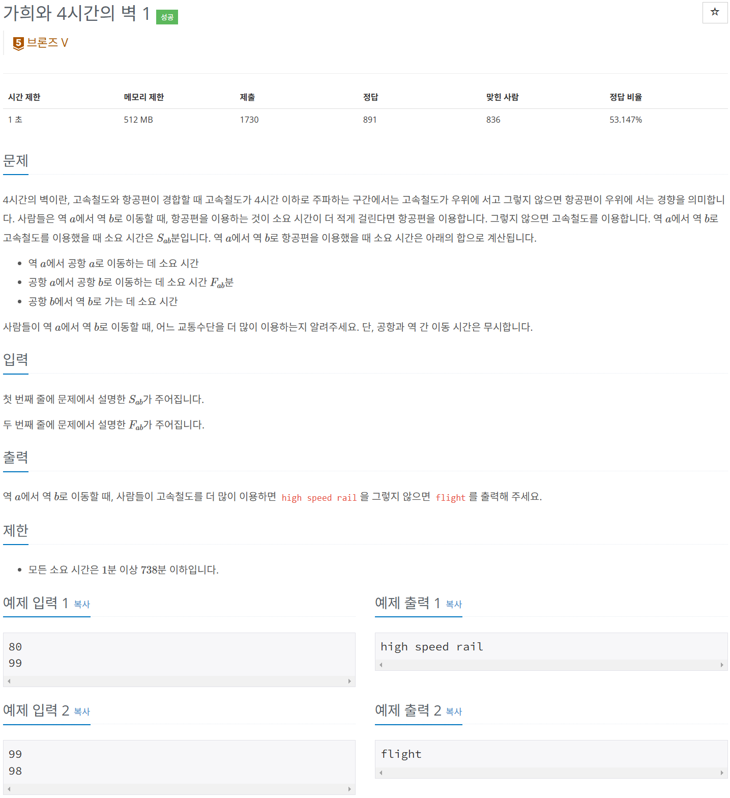 고속철도와 항공편의 소요 시간을 비교하는 문제이다.