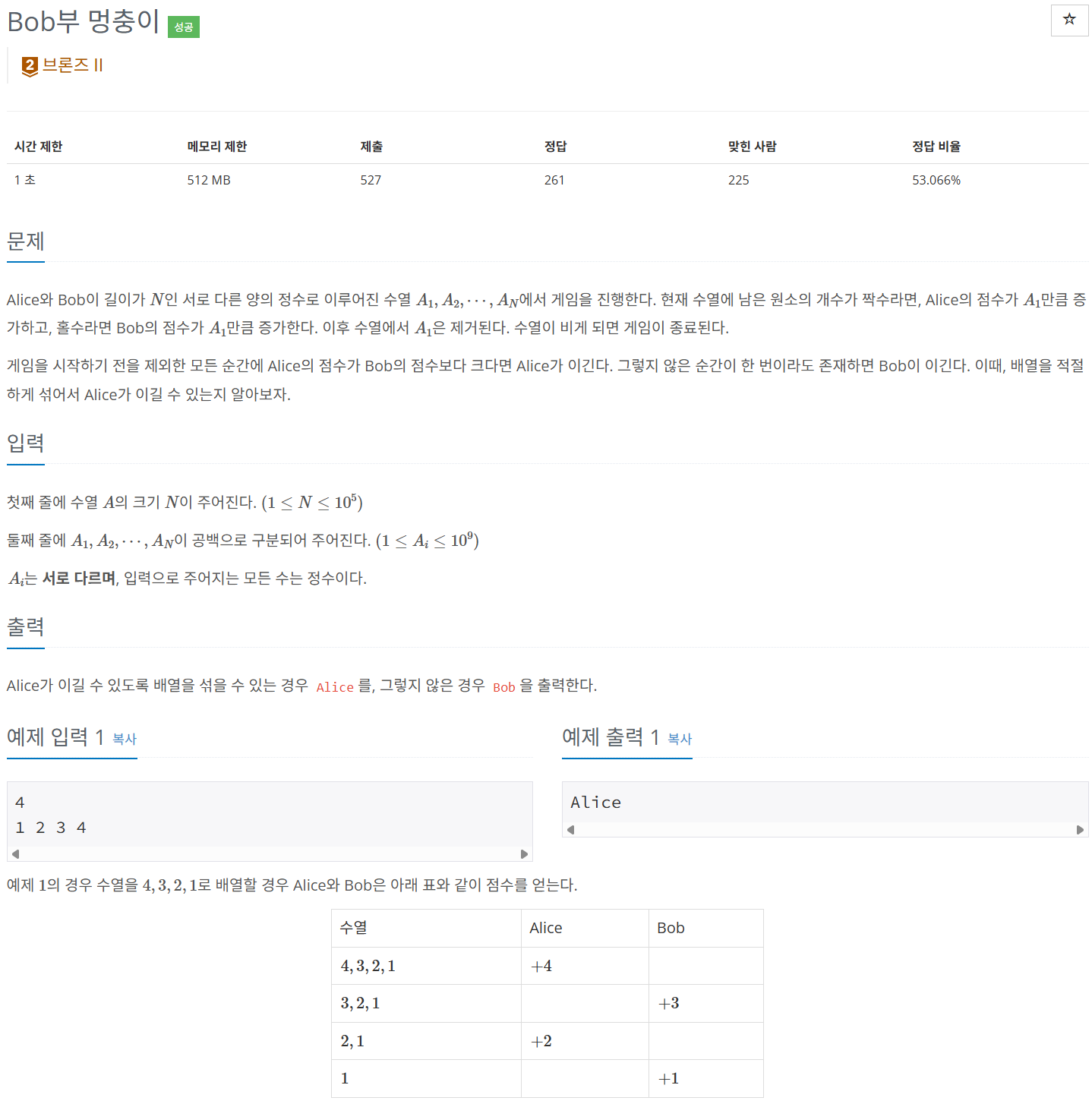 생각해 보니 주어지는 N이 짝수이면 Alice가 이기고 홀수이면 Bob이 이긴다는 것을 깨달았다.