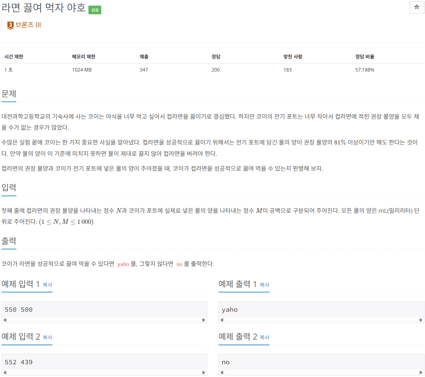 M이 N의 81% 용량보다 크거나 같다면 라면을 성공적으로 끓여 먹을 수 있다.